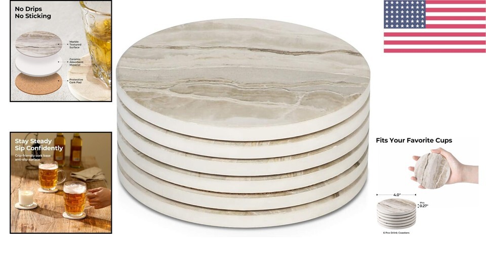 Set of 6 Non-Slip Marble Style Ceramic Coasters - Perfect for Hot & Cold Drinks