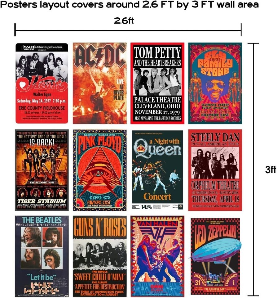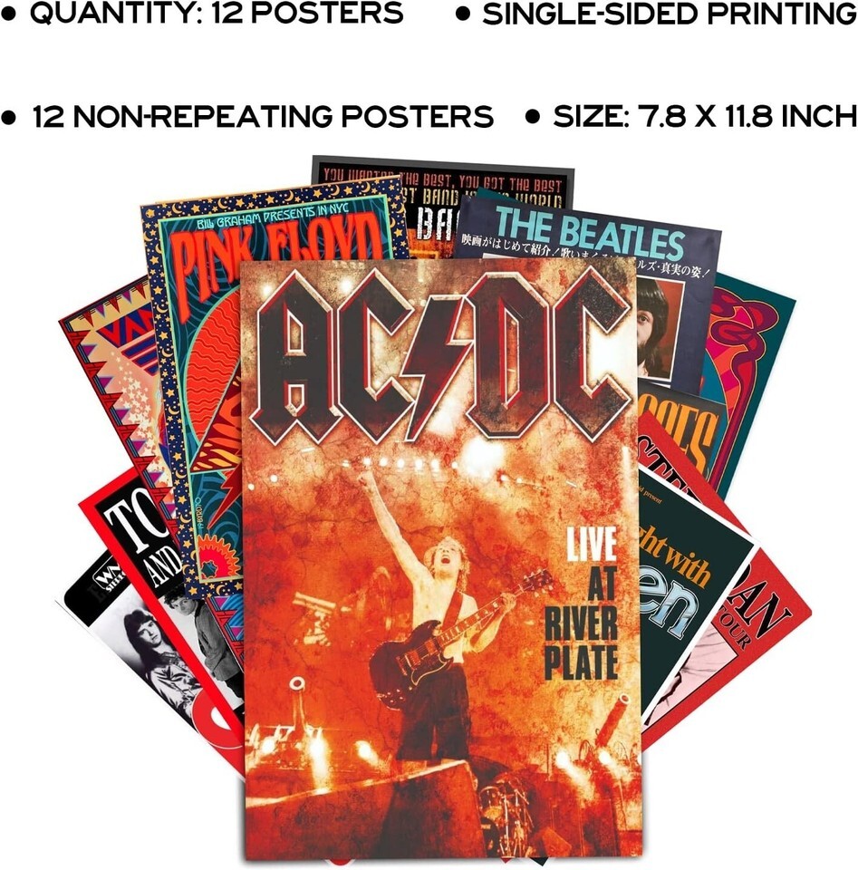 Set of 12 Vintage Rock Band Posters - 7.8x11.8 Retro Wall Art for Music Lovers