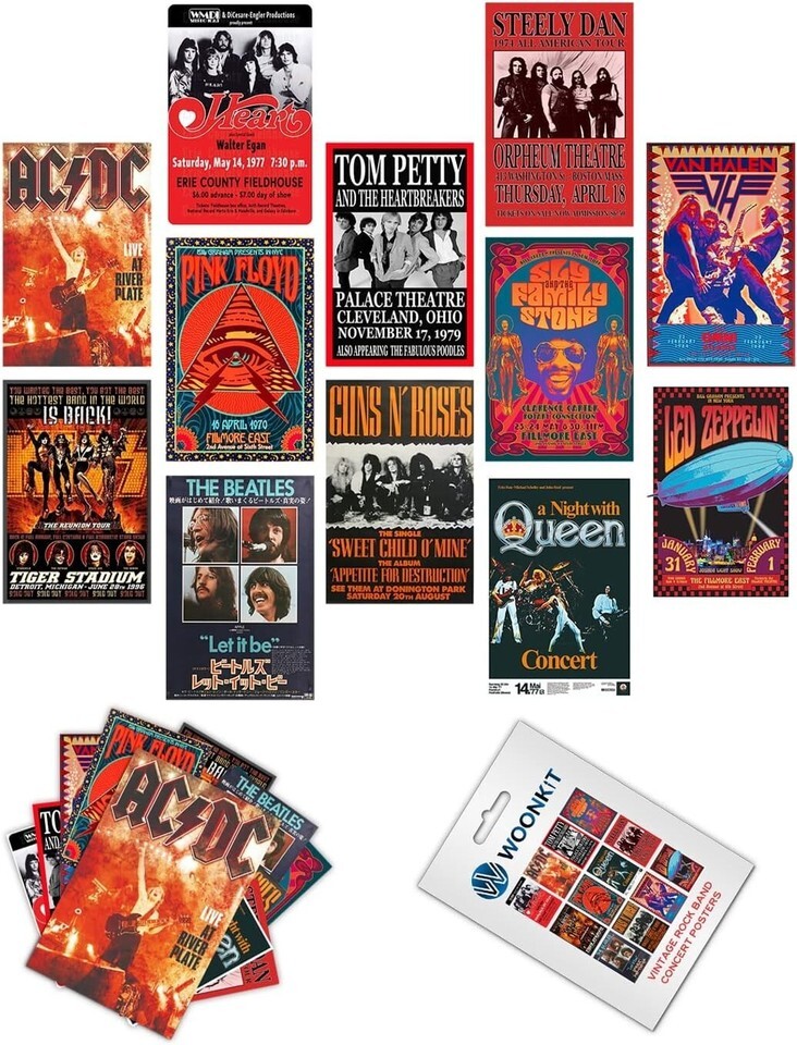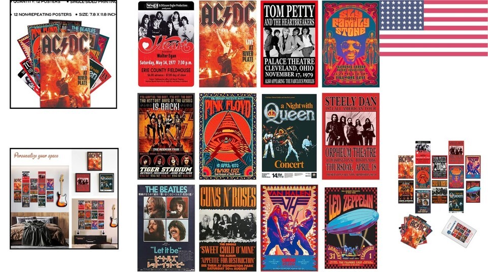 Transform your environment into a tribute to the legends of rock with this set of 12 vintage rock band posters. Each piece showcases a nostalgic glance at iconic concerts, allowing you to relive the golden era of music. Whether you choose to frame them or hang them directly on your walls, these posters are more than just decoration; they're a celebration of musical history and passion.