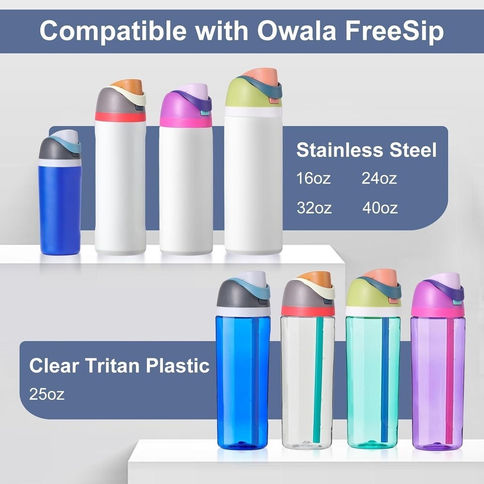 Perfect compatibility with Owala Freesip Stainless Steel water bottles in sizes 16oz, 24oz, 32oz, 40oz, and 25oz Clear Tritan Plastic water bottles.