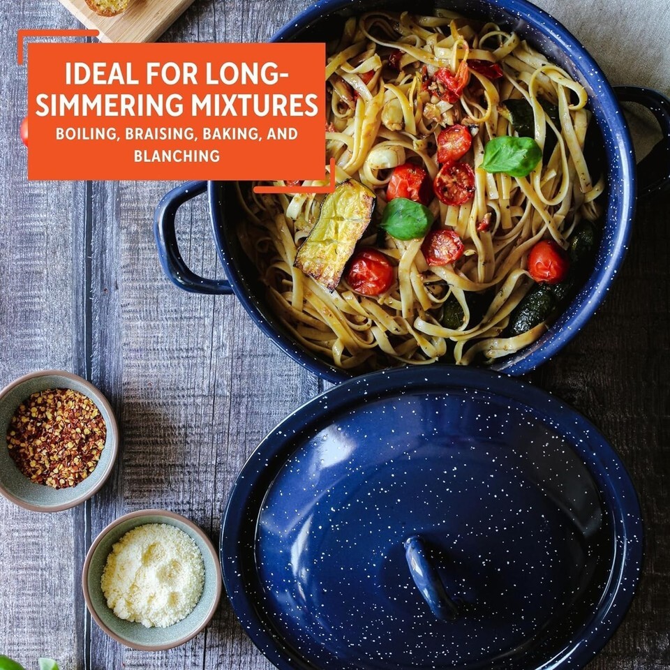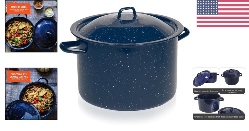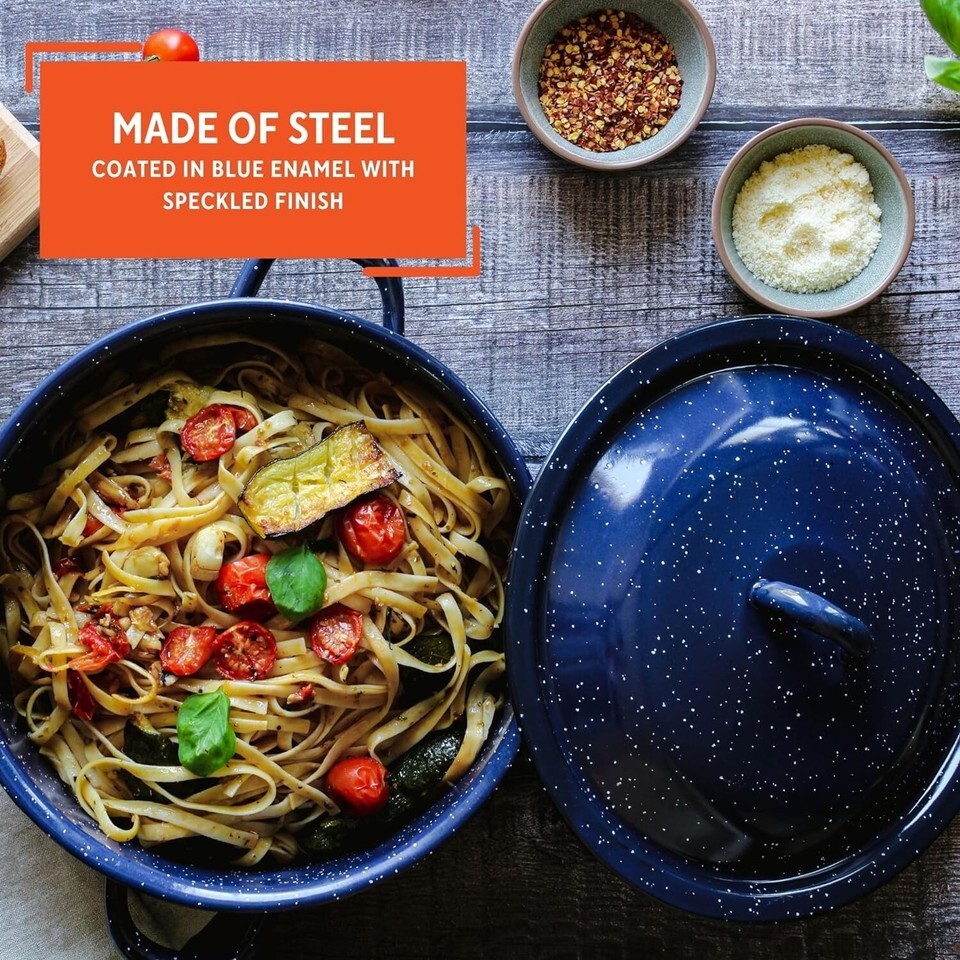 Durable and Stylish Design: Crafted from durable steel and featuring a stunning blue enamel speckled finish, this pot not only boasts exceptional heat retention but also adds a touch of charm to your kitchen. Its smooth glass enamel surface allows for effortless cleaning and promotes chemical-free cooking.
