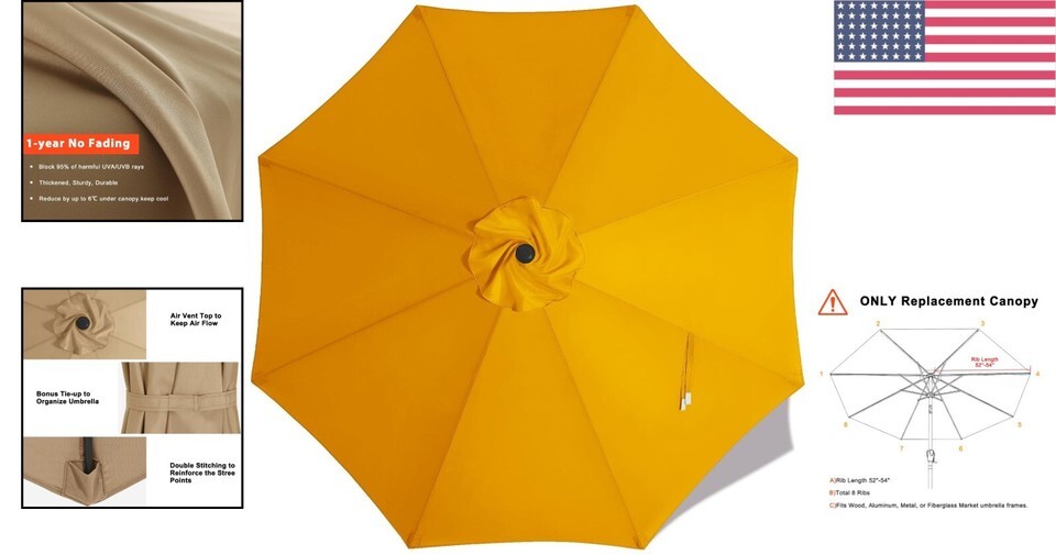 Transform your outdoor space with our exquisite 9 ft Gold Replacement Canopy specifically designed for 8 rib patio umbrellas. This canopy not only enhances the aesthetic appeal of your patio but also provides essential protection from harmful UV rays.