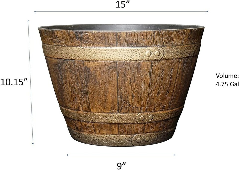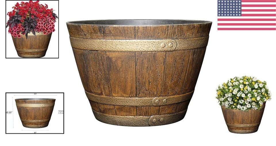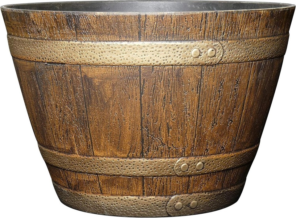 Stylish 15" Oak Brown Resin Flower Pot - Weather Resistant Whiskey Barrel Design