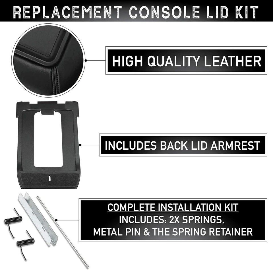 Don?t let a worn-out console lid compromise the comfort and aesthetics of your vehicle. Our Center Console Lid Replacement Kit is the perfect blend of quality, ease of installation, and secure fit ? making it the ideal solution for every Silverado or Sierra owner. Made from high-quality materials, it not only matches the durability of OEM parts but also enhances the overall look of your interior.