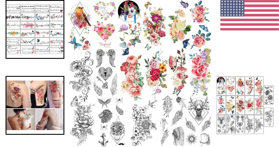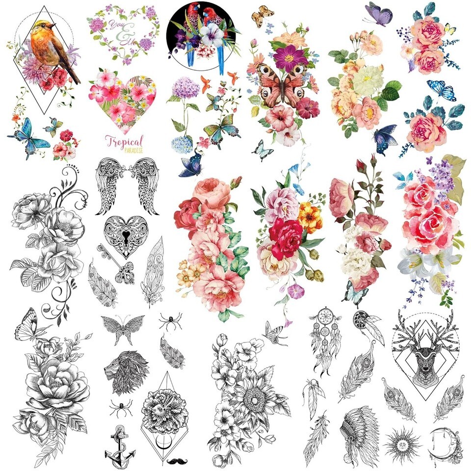 Floral & Feather Temporary Tattoo Stickers - 41 Designs, Waterproof & Non-Toxic