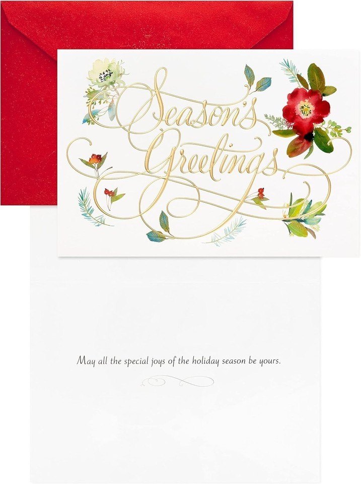 Delight your loved ones this holiday season with our stunning boxed set of holiday greeting cards. Each card is festively adorned with a gold foil "Season's Greetings" design, elegantly bordered by intricately illustrated watercolor flowers and lush greenery, creating a captivating display that embodies the spirit of the season.