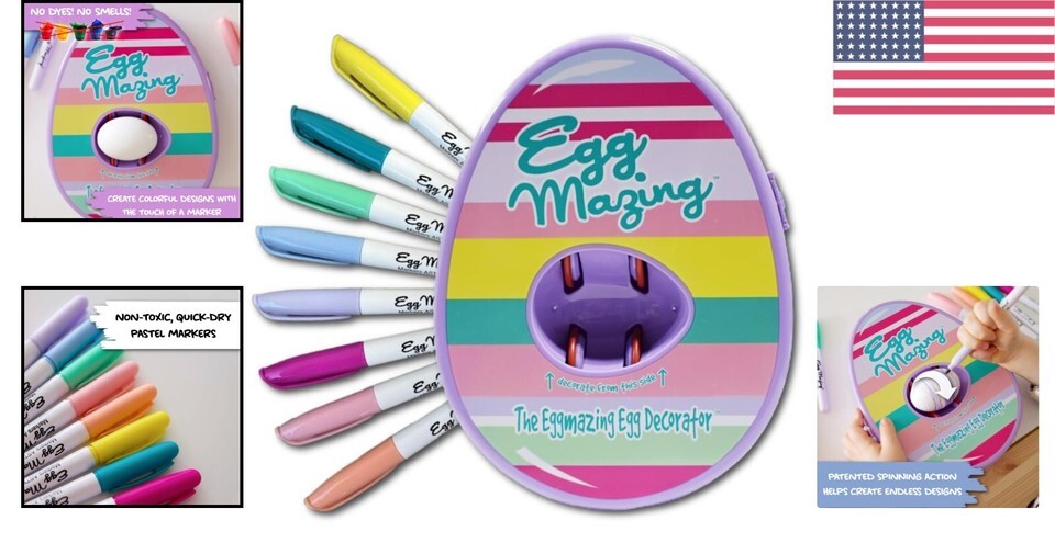 Kit includes 1 EggMazing Spinner and 8 colorful non-toxic markers.