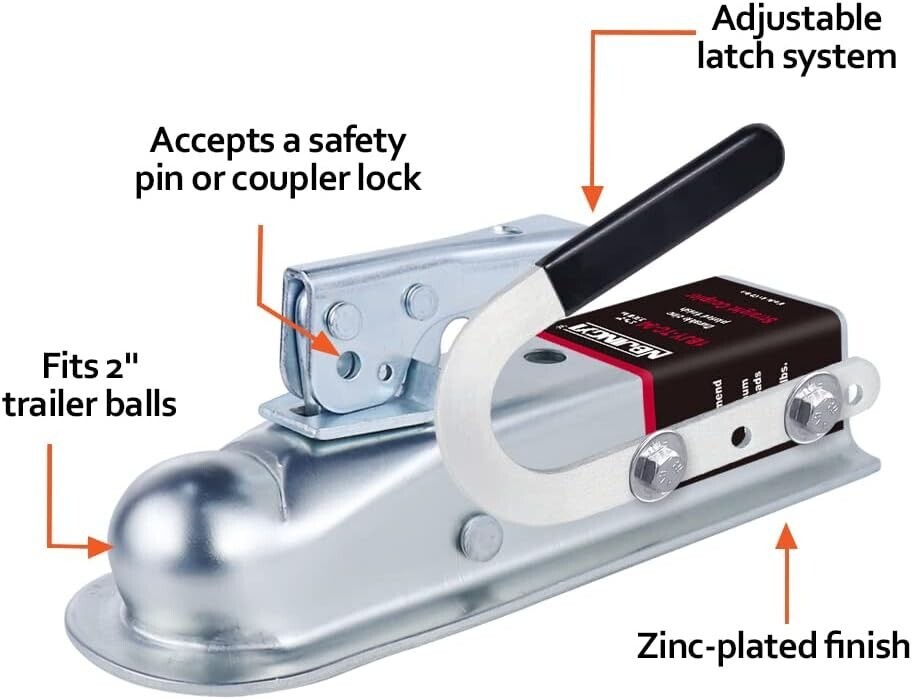 When it comes to towing, reliability is key. Our Durable Powder-Coated 2" Channel Wide gives you the confidence to haul heavy loads, featuring a remarkable 3500 LB towing capacity and an easy-lock latching system for simple operation. Crafted from thick die-cut steel with a rust-resistant zinc finish, this coupler is built to withstand the elements and provide long-lasting performance.
