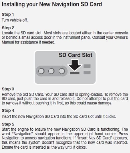 Start the engine to activate the new card; confirm the "Navigation" prompt appears in the upper right corner of your display.