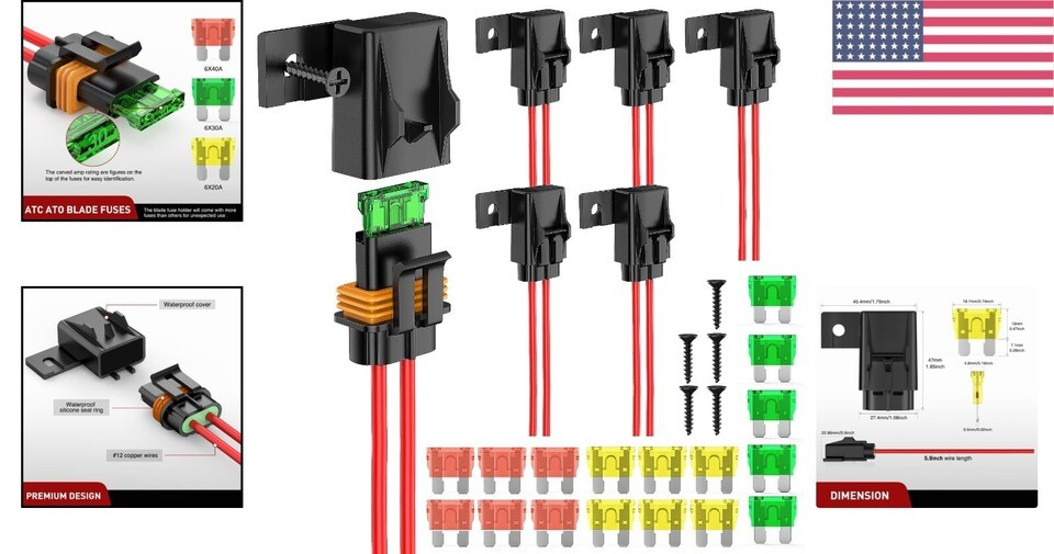 6pcs Waterproof Inline Fuse Holders with 18 ATC Blade Fuses - 12AWG Heavy Duty