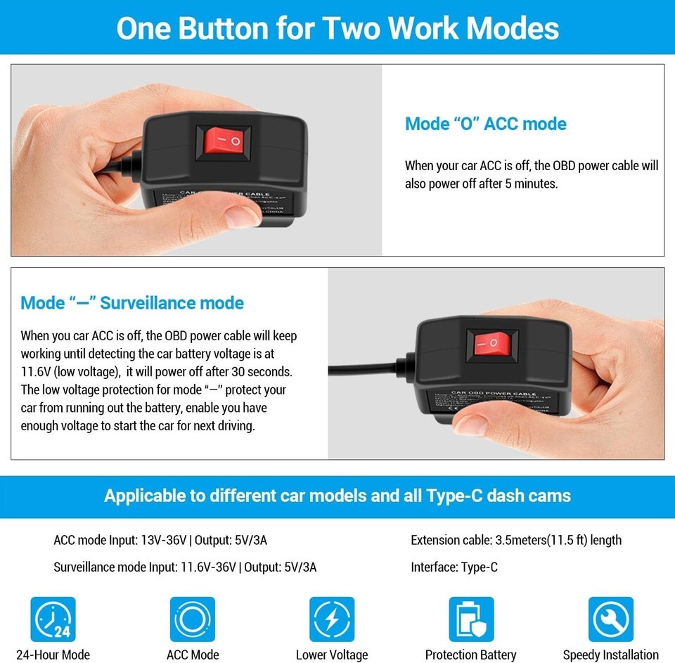 Dash Cam OBD Power Cable - Universal Type-C Charger with Two Modes 3.5m Length