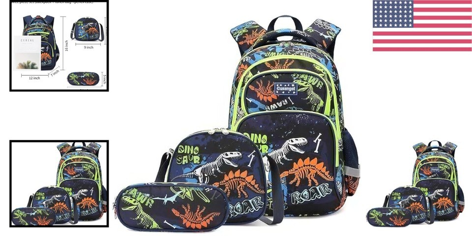Water-Repellent 3-Piece Dinosaur Set: Backpack, Lunch Box Pencil Case for Kids