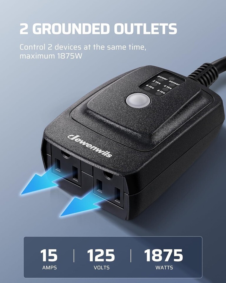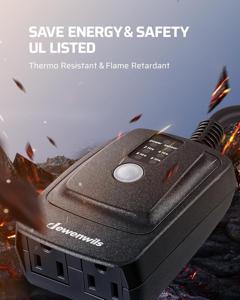 Countdown Timer and Light Sensor: Multiple settings including ON/OFF, dusk to dawn, and flexible options for turning on at dusk and off after 2, 4, 6, or 8 hours.