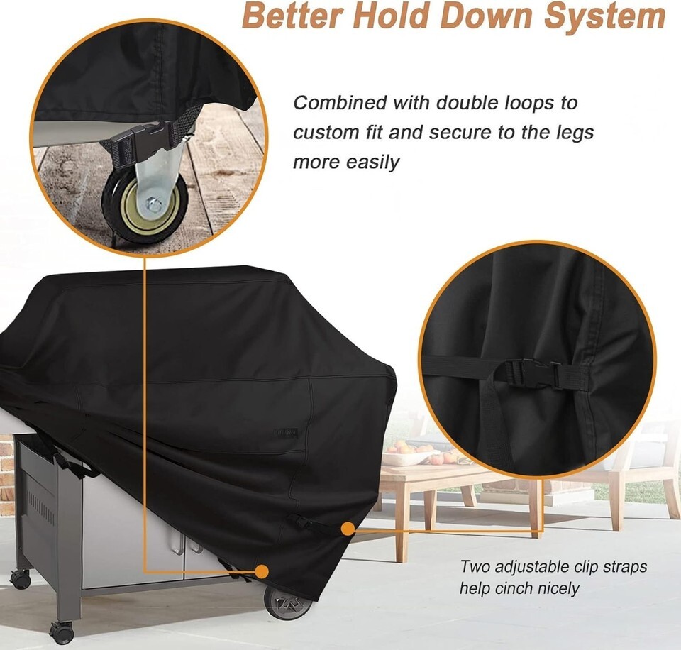 Two adjustable straps and four buckles for a secure fit, preventing the cover from blowing off in high winds.