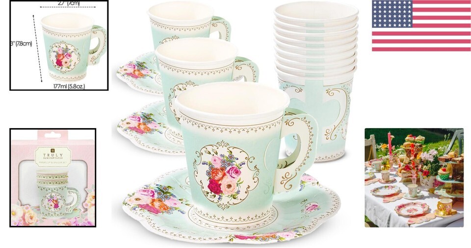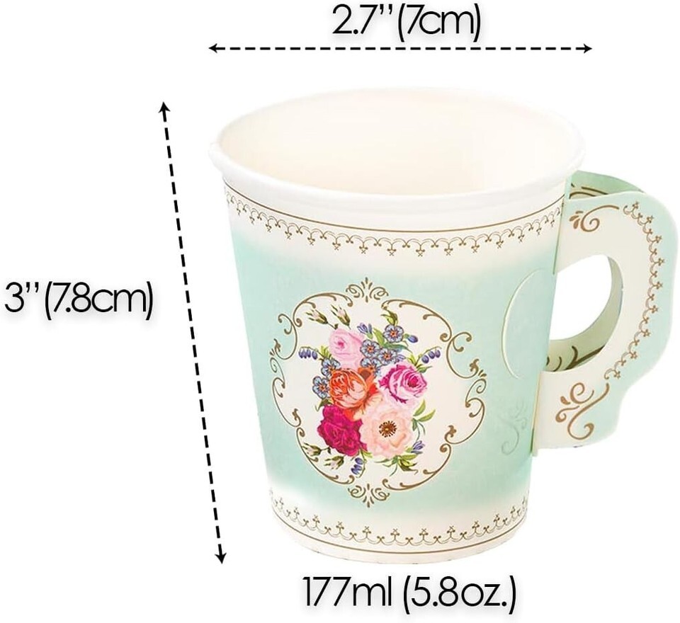 Elegant 12 Set Mint Green Floral Paper Tea Cups & Saucers for Stylish Gatherings