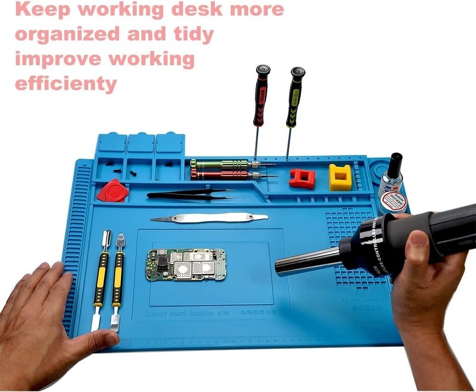 Upgrade your repair workspace with this Large Anti-Static Silicone Soldering Mat. Engineered for high temperature and efficiency, it allows you to work confidently, knowing your tools and components are secure and organized. From delicate electronics to everyday gadgets, this mat is designed to meet the demands of all your projects.