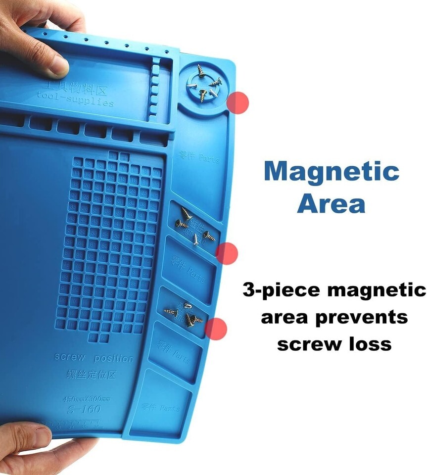 Features: Heat Resistant,Non-Toxic,Anti-Static,Corrosion Resistant,Easy to Clean,Flexible,Durable,Foldable,Anti-skid,Retardant,Built-in Scale Ruler,Magnetic Parts Areas,Organized Part Boxes