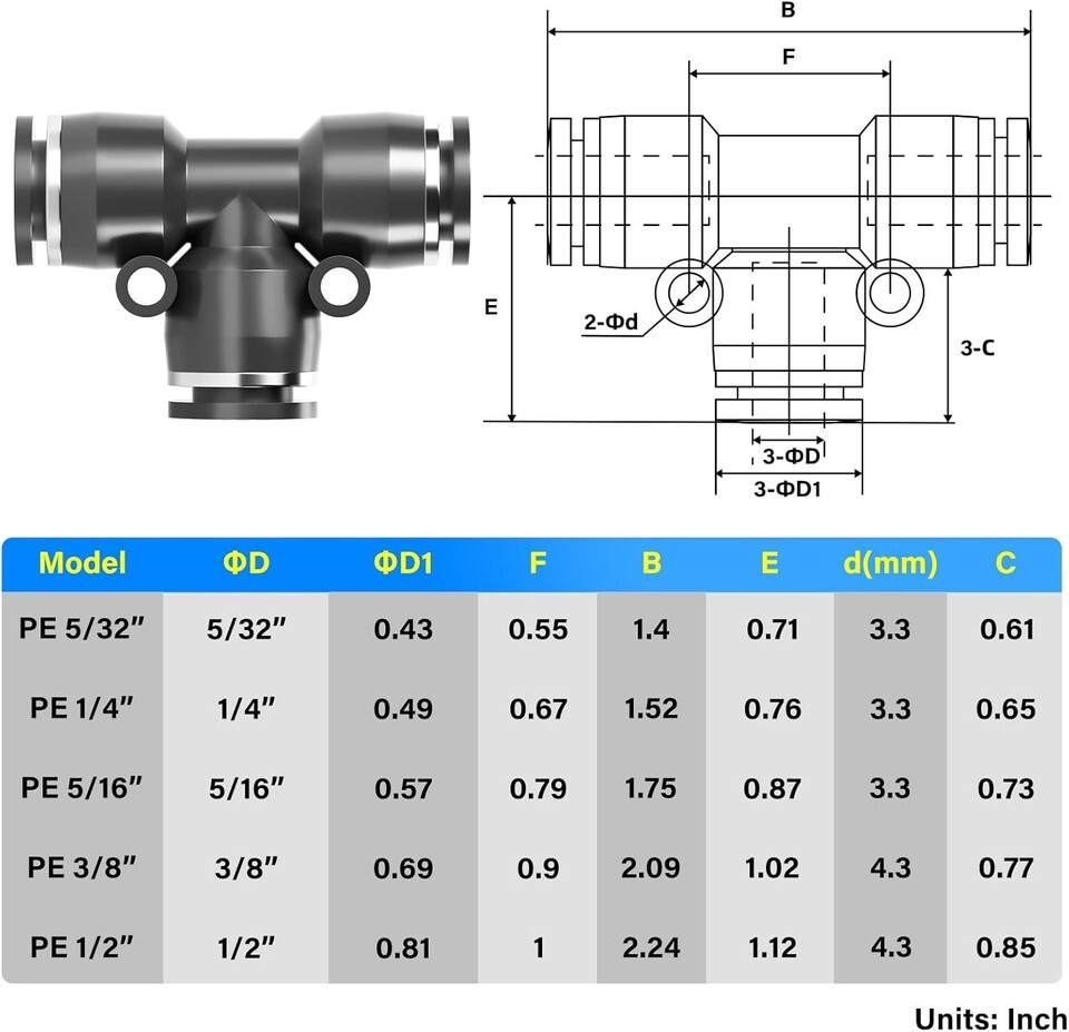 End C Diameter/Tube OD (for Tees): 1/4 in (6.35 mm)