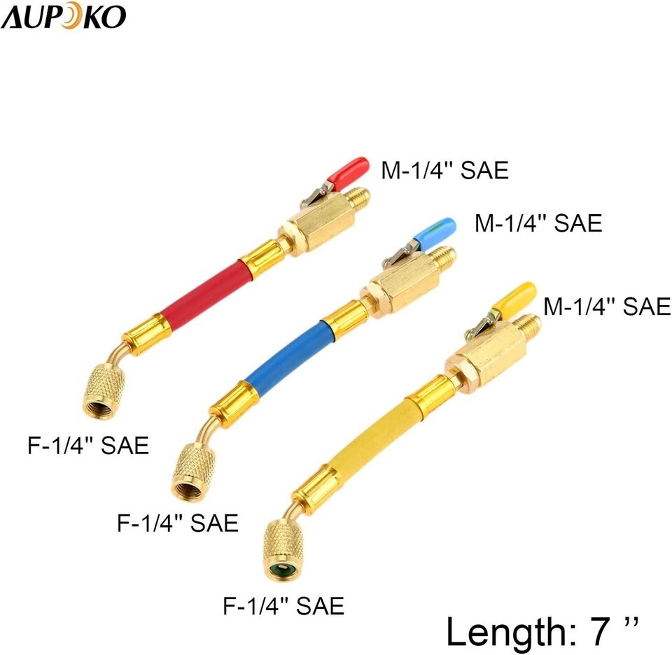 3 pieces of 7" color-coded R12 R22 A/C charging hoses with ball valve.