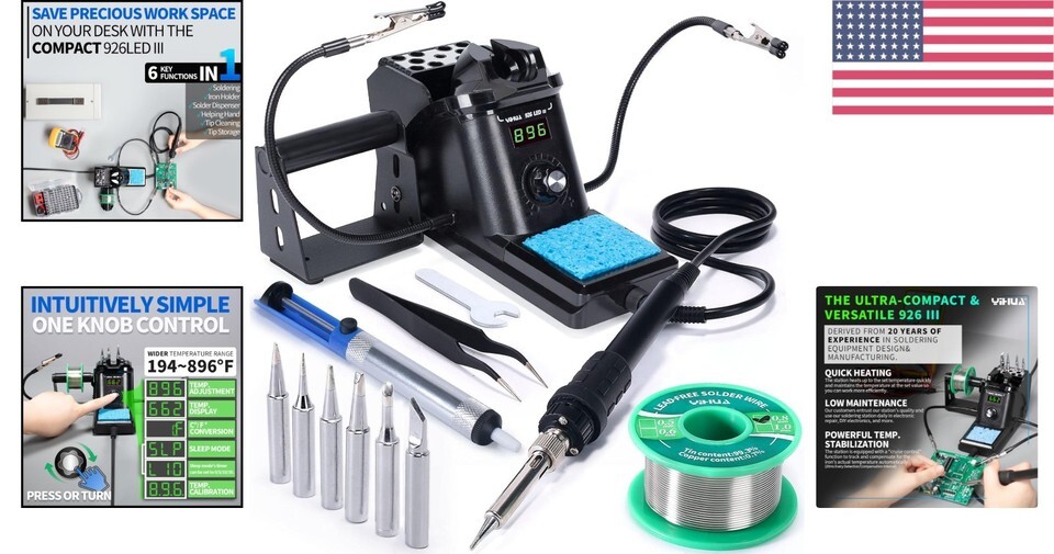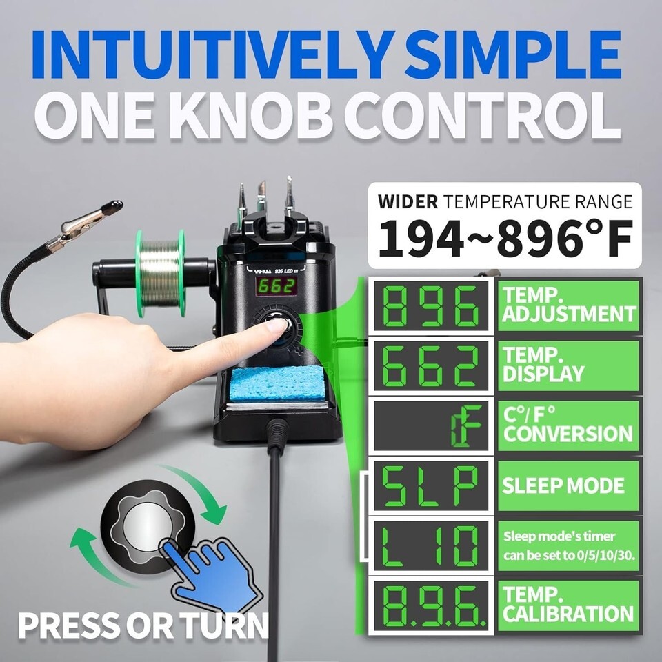 Features: Temperature Controlled,Fast Heating,Adjustable Temperature,PID Temperature Stabilization,C/ºF Conversion,Auto Sleep,Calibration Support,Digital Display,Metallic Protective Mesh,Soldering Tip Storage Slots,Solder Wire Dispenser,Cleaning Sponge