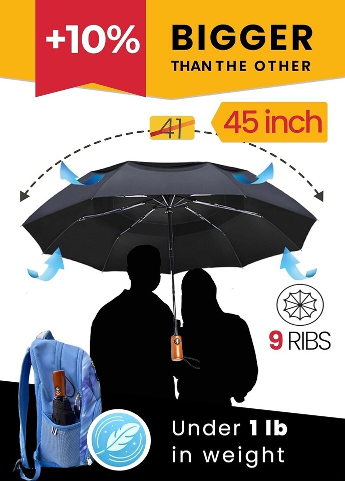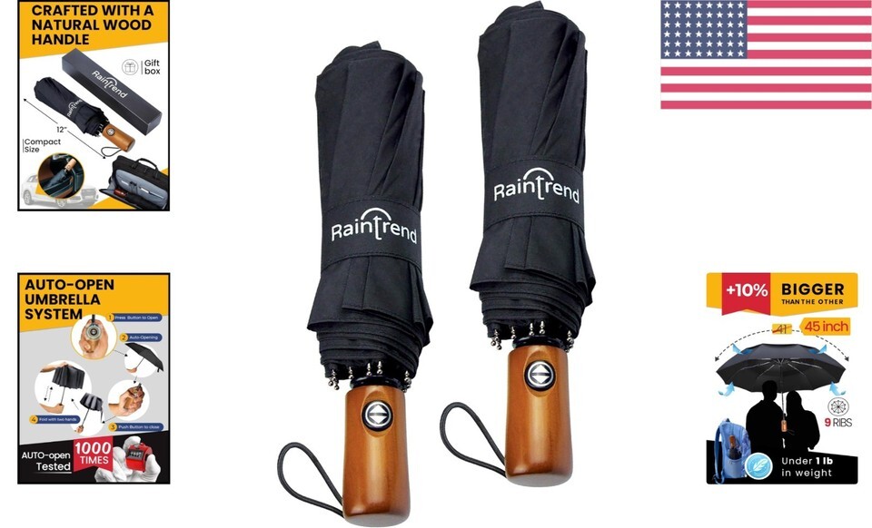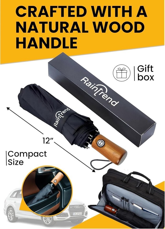 Don?t let the rain dampen your spirits! With our Compact Yet Spacious Windproof Umbrellas, you?ll be ready for any weather while maintaining an air of elegance. Perfectly crafted with a classic ergonomic wooden handle and a robust design, these umbrellas will not only protect you and your loved ones from downpours but do so with sophistication.