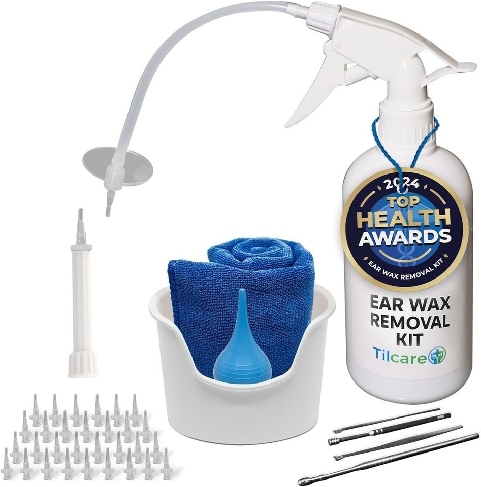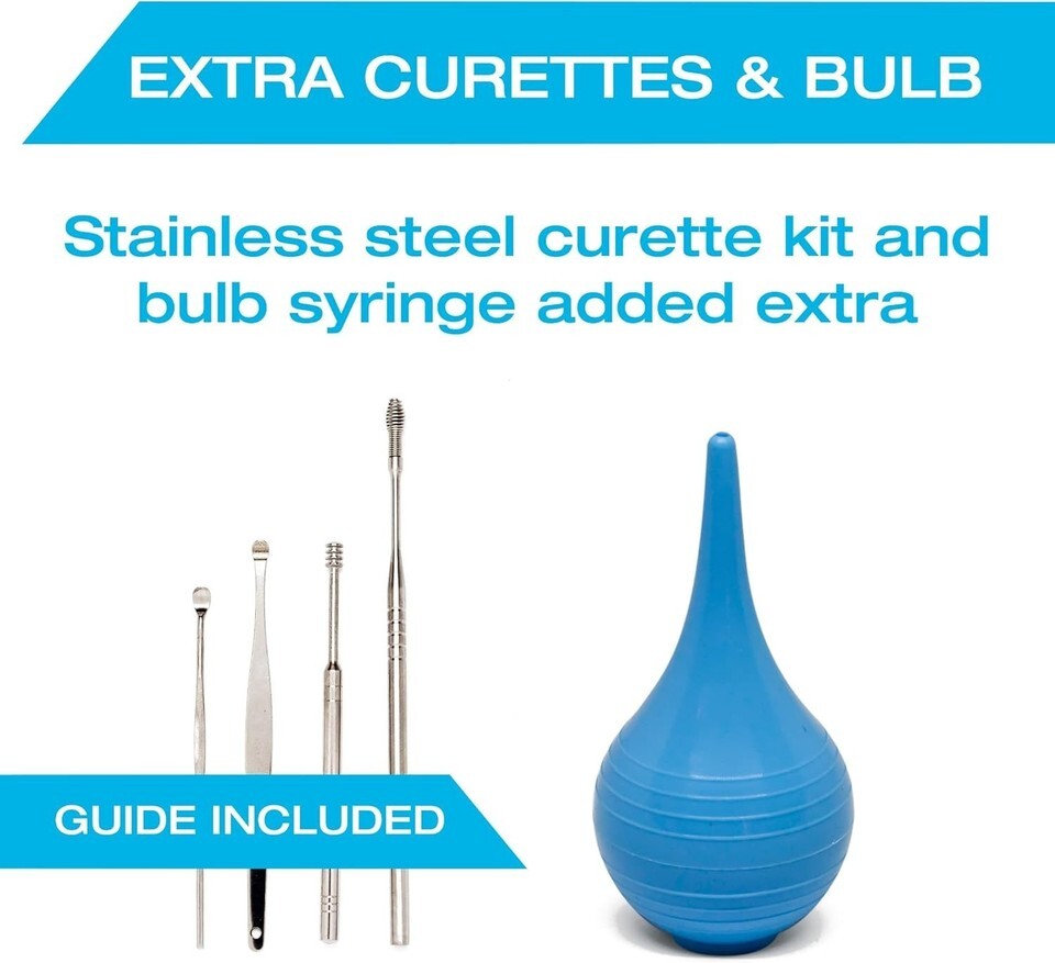 Complete Ear Cleaning Kit: This comprehensive kit includes an ear wash spray bottle, basin, bulb syringe, a four-piece curette kit (spoon and spiral), microfiber towel, and 30 disposable tips, ensuring you have all the tools needed for effective ear wax removal.