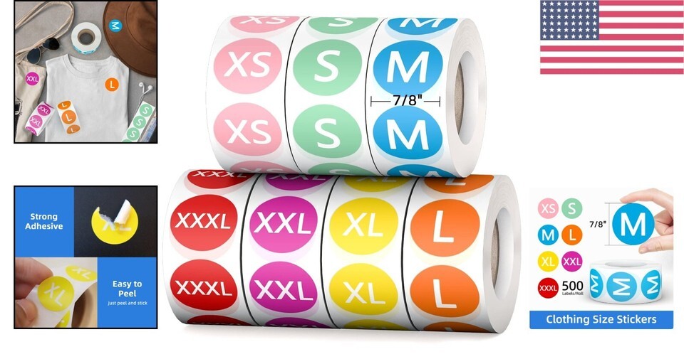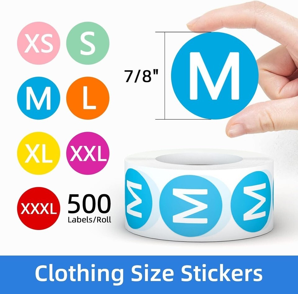 Comprehensive Size Coverage: 3500 pcs size stickers with 7 rolls, 500 labels for each size, covering FULL sizes XS, S, M, L, XL, XXL, XXXL.