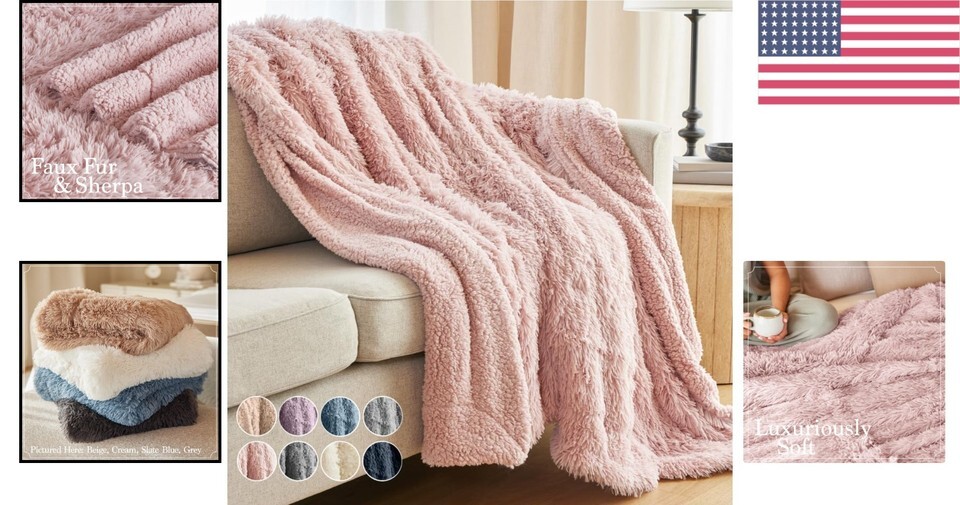 Luxurious 70x60 Dusty Rose Fluffy Shag Sherpa Reversible Throw Blanket