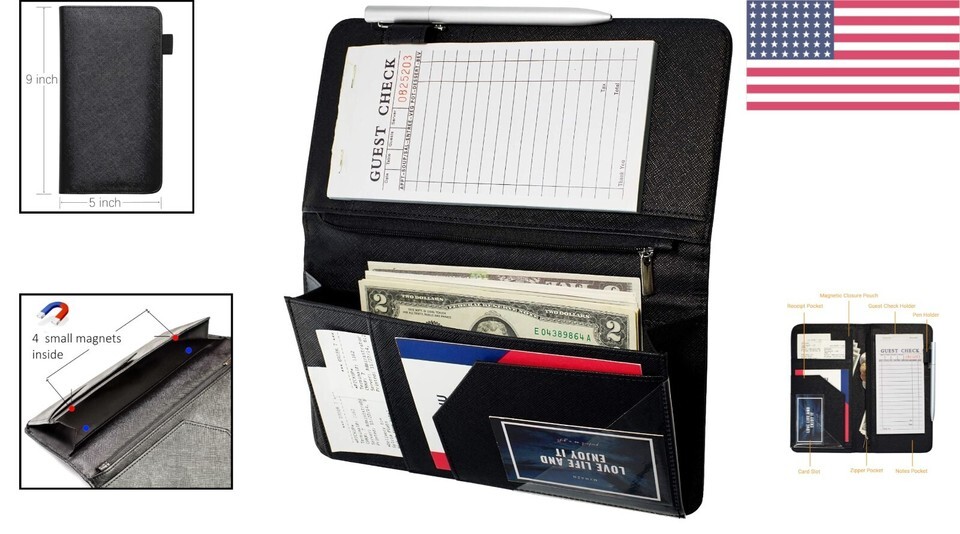 All-in-One Organization: This versatile organizer includes dedicated slots for cash, coins, note pads, pens, credit cards, and wine/food menu specials, ensuring everything you need is right at your fingertips.