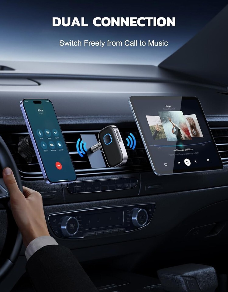 Bluetooth 5.0 Car Receiver - Noise Cancelling AUX Adapter with 16H Battery Life