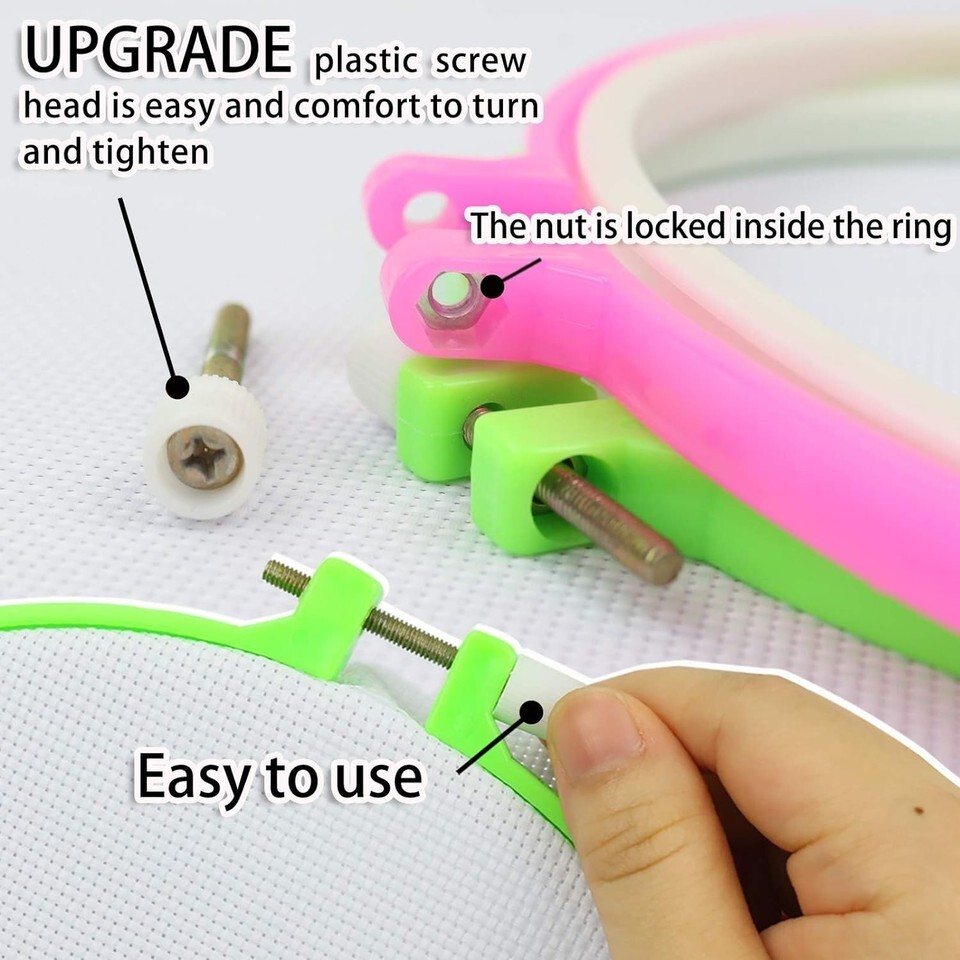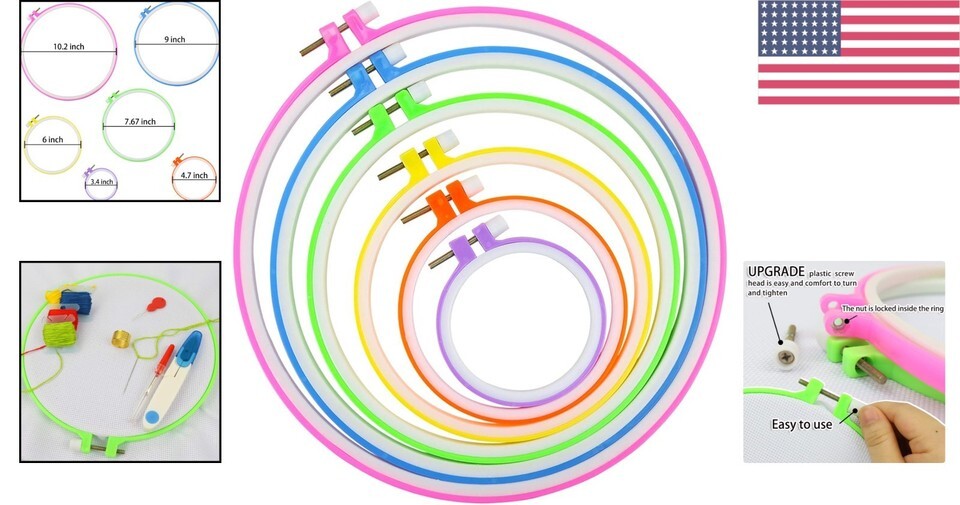 Includes 6 plastic embroidery hoops in varying sizes: 3.4", 4.7", 6.1", 7.7", 9", and 10.2".