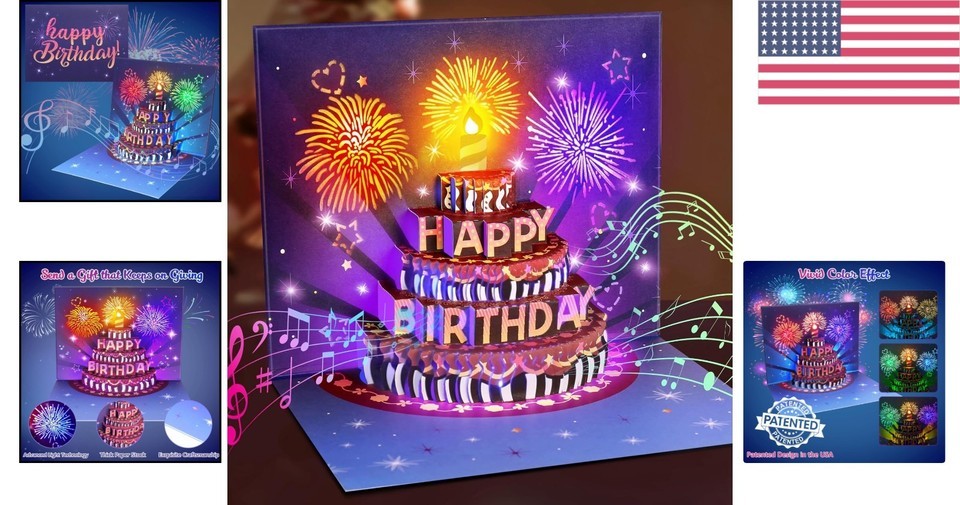 Features: Musical,Fireworks,Pop Up Cake,Light Effect,Intricate Circuit,High Quality Cardstock,3D Design,Color Changing,Space for Message,Pre-printed Message,Battery Operated