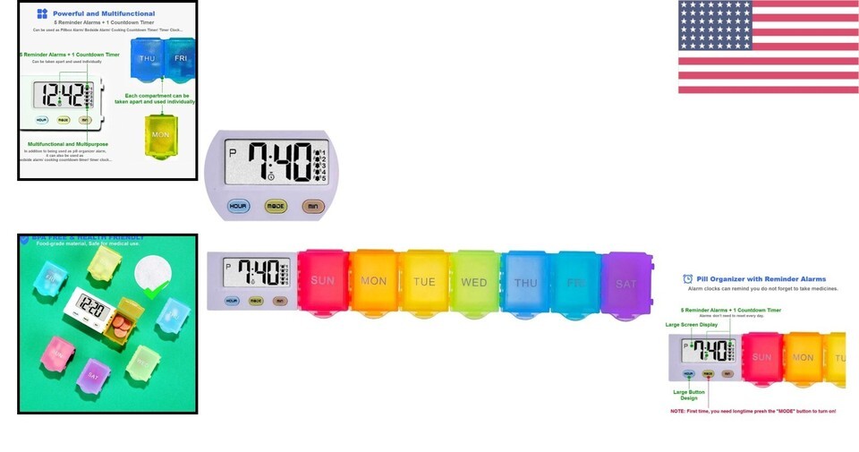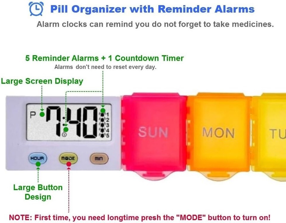 Powerful and Multifunctional: Equipped with 7 compartments, 5 reminder alarms, and a countdown timer, this organizer is versatile enough to serve multiple purposes, from reminding you to take your medication to functioning as a cooking timer.