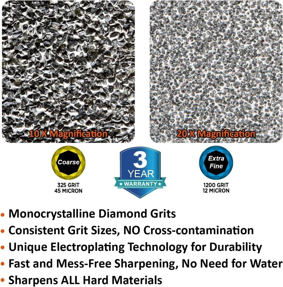 Fast and Durable: Electroplated with industrial monocrystalline diamonds on a stainless steel base, making sharpening up to 5 times faster than traditional oil or water stones.