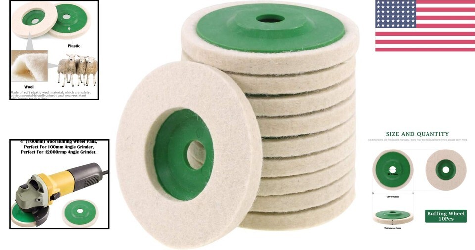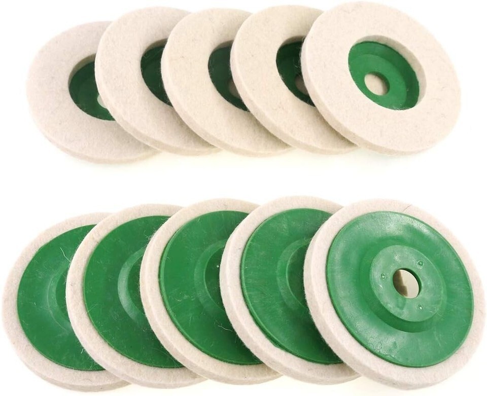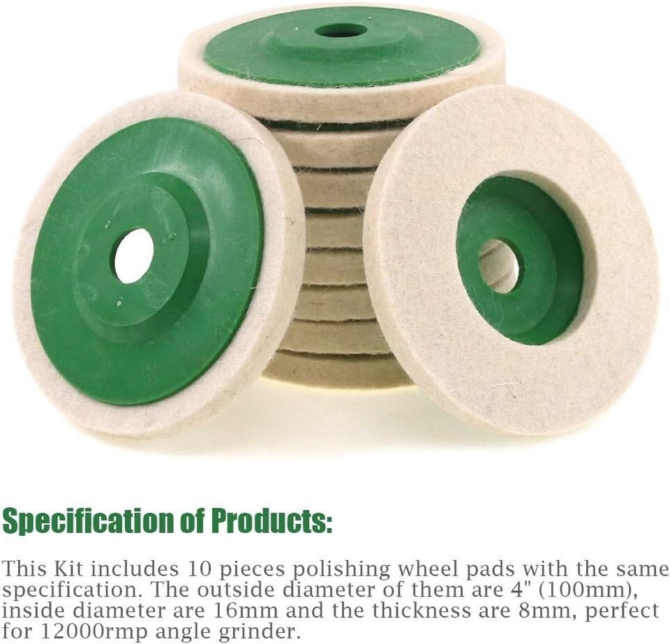Specifications: Each kit includes 10 identical wool felt disc wheels. Outside diameter: 4" (100mm), inside diameter: 16mm, thickness: 8mm. Compatible with angle grinders operating under 7000-8000 RPM.