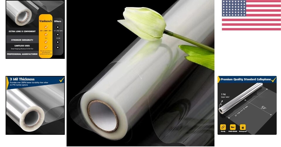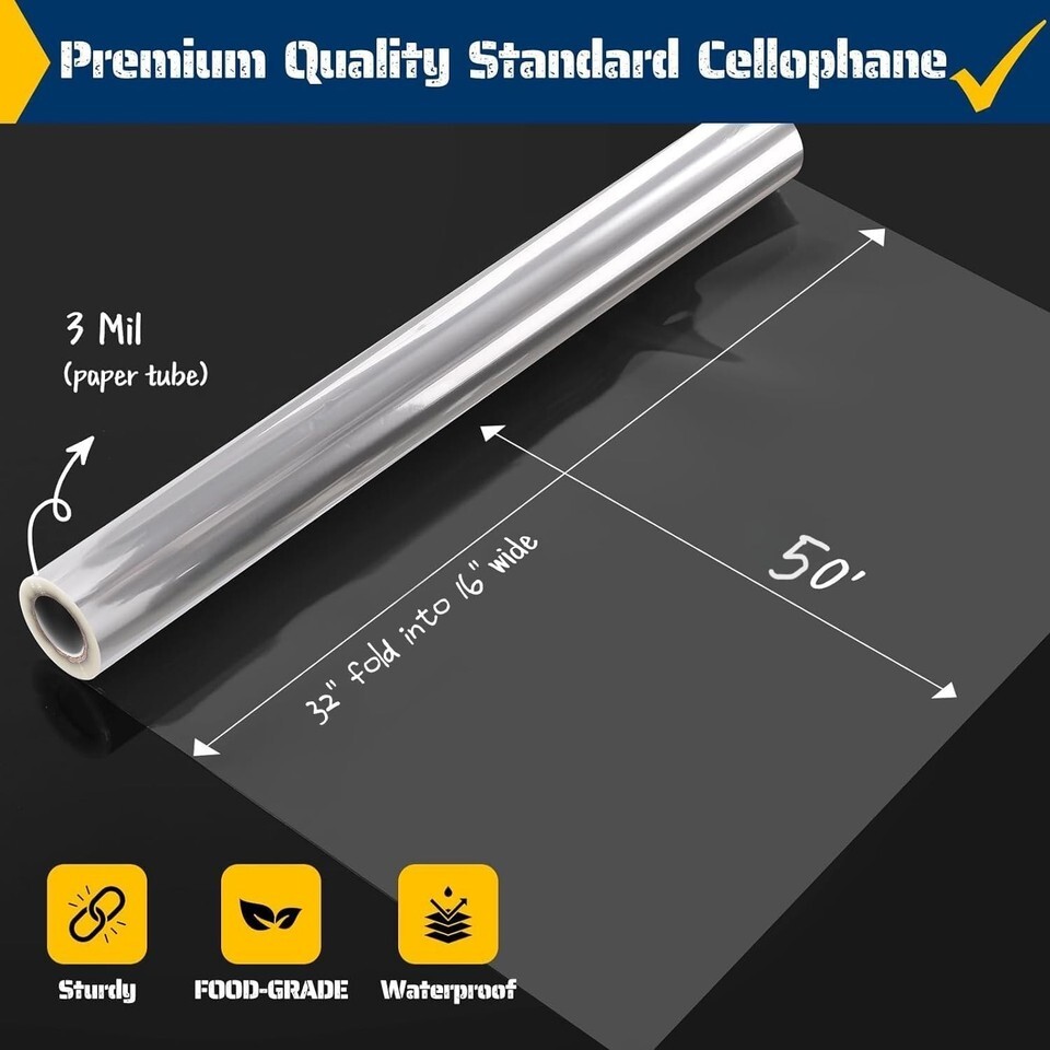 Versatile 50 ft Clear Cellophane Wrapping Paper - 3Mil Thick, Space-Saving Roll