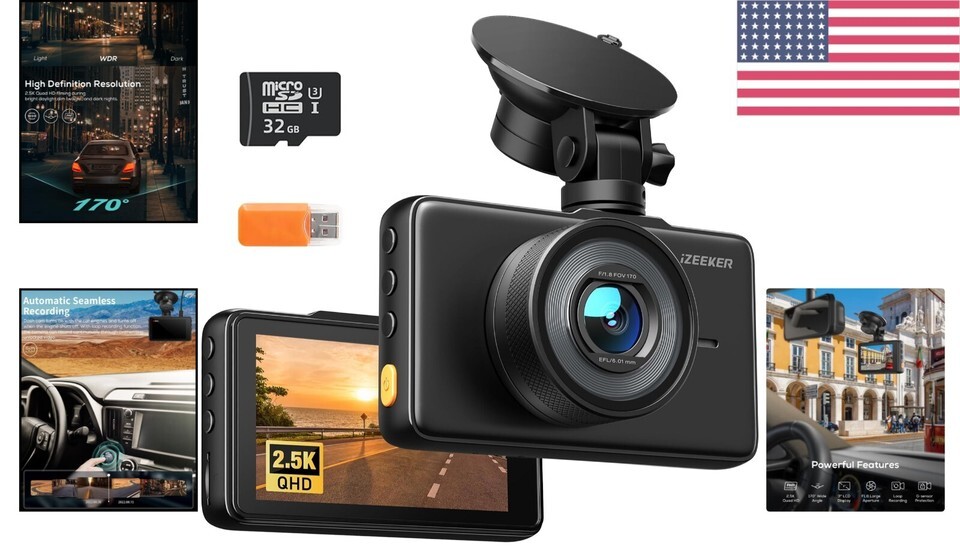 High-Definition 2.5K Dash Camera with Night Vision Loop Recording - 32GB Card