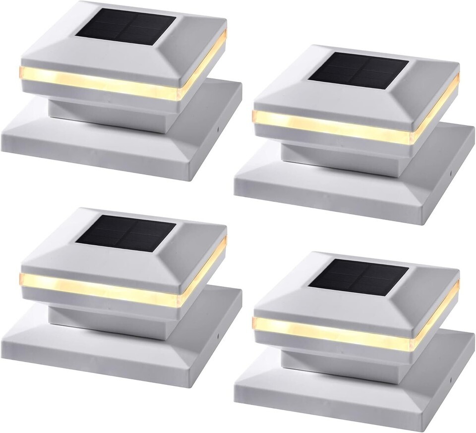 Pack of 4 solar-powered post cap lights, each featuring 8 warm white SMD LEDs.