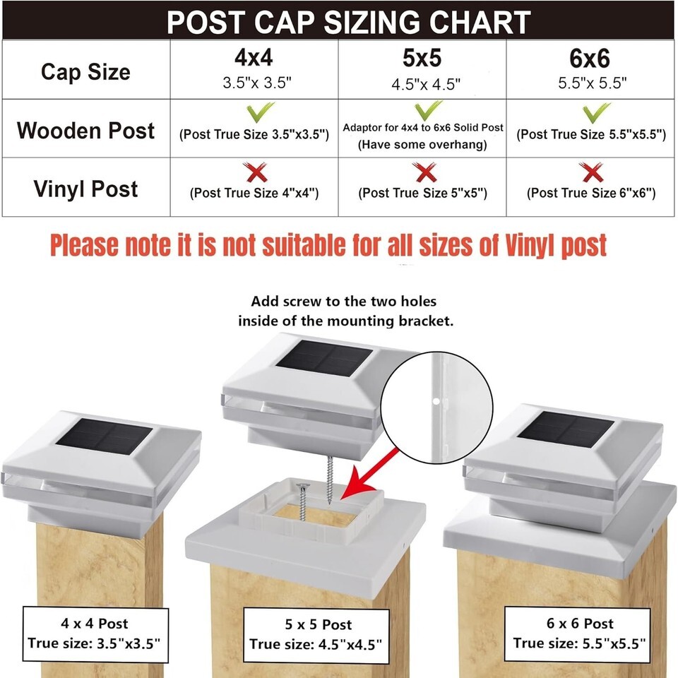 Includes two different-sized caps with inner sizes of 3.5" x 3.5" and 5.5" x 5.5", perfect for both 4x4 and 6x6 square wooden post caps.