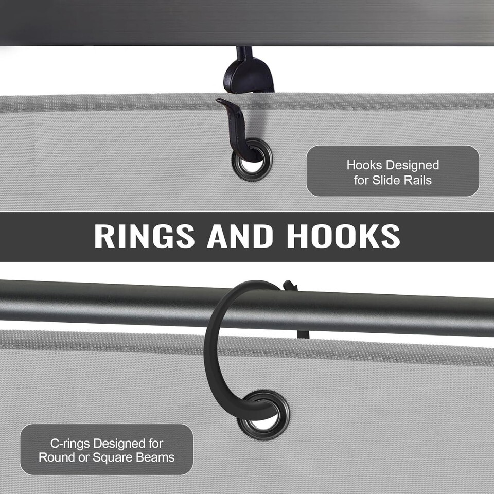 EASY TO INSTALL: The netting is equipped with C-Rings and hooks for a user-friendly setup, accommodating various gazebo configurations. Hooks are perfect for sliding rails, while rings cater to square or round tubes with a maximum diameter of 1 inch.