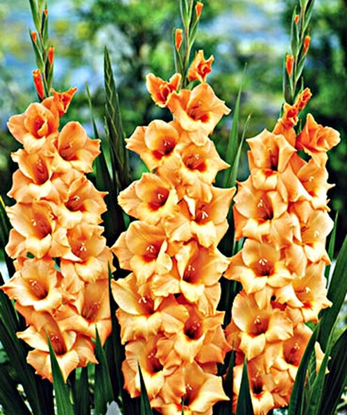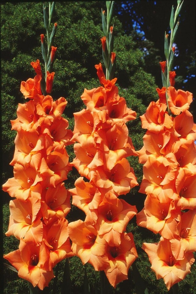 Peter Pears Gladiolus displays orange flowers during the summer months.