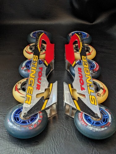 A vendre est un ensemble d'occasion d'avions a rouleaux en ligne Tour Stinger 7000, cadre en aluminium, 5 roues, pales de roulement.