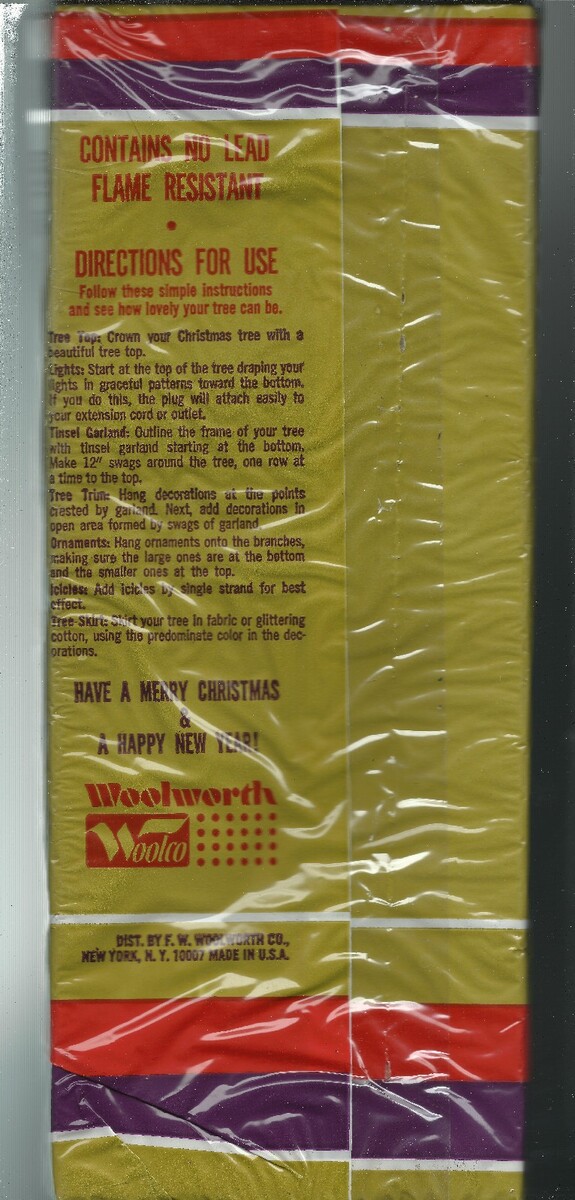 (1) VINTAGE BAG OF 750 STRANDS OF ICICLES MADE BY WOOLWORTH COMPANY MPN 527517. VINTAGE OPENED PLASTIC PACKAGING WITH TRY OF 750 STRANDS INSIDE, DESIGNED FOR EASY USE WHEN DECORATING. THIS ITEM IS FROM THE 60s OR 70s, SINCE NO UPC NUMBER, PRICE OF 53 cents PRINTED ON THE PLASTIC, CLASSIC FLAME RESISTANT AND CONTAINS NO LEAD, EACH STRAND MEASURES 18" LENGTH. YOU WILL RECEIVE ONE 1 VINTAGE USED BAG OF WOOLWORTH BRAND ICICLES , AS PICTURED, SHIPPED BY USPS....
