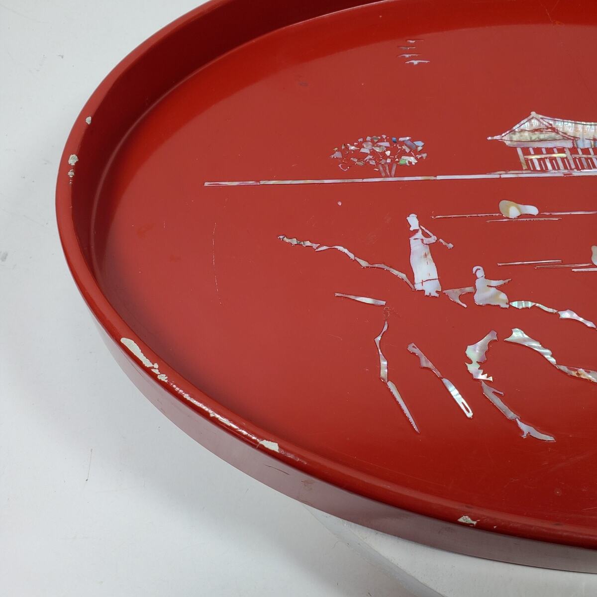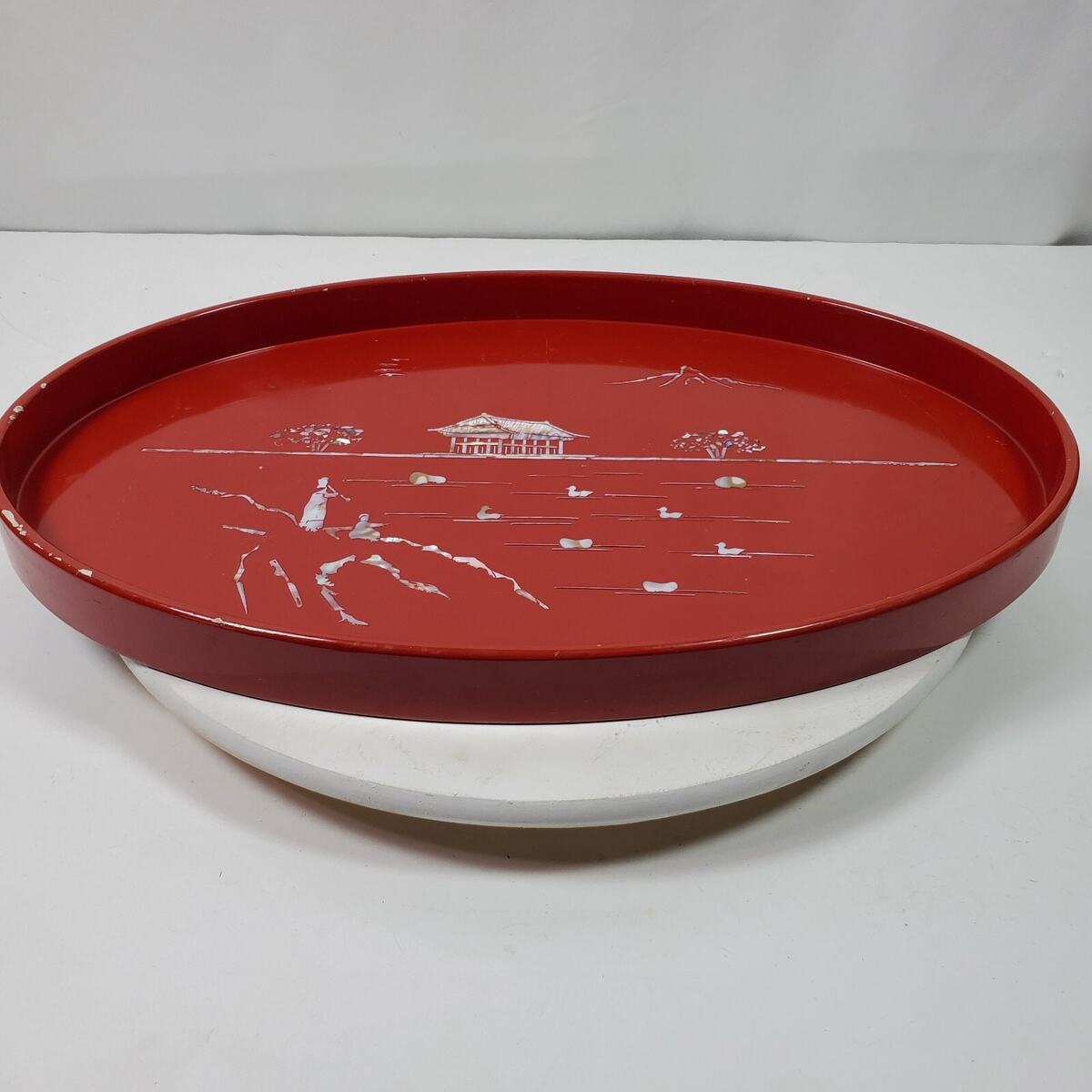 Vintage Red Oval Wood & Mother of Pearl Serving Tray 18 Inch Long