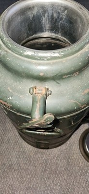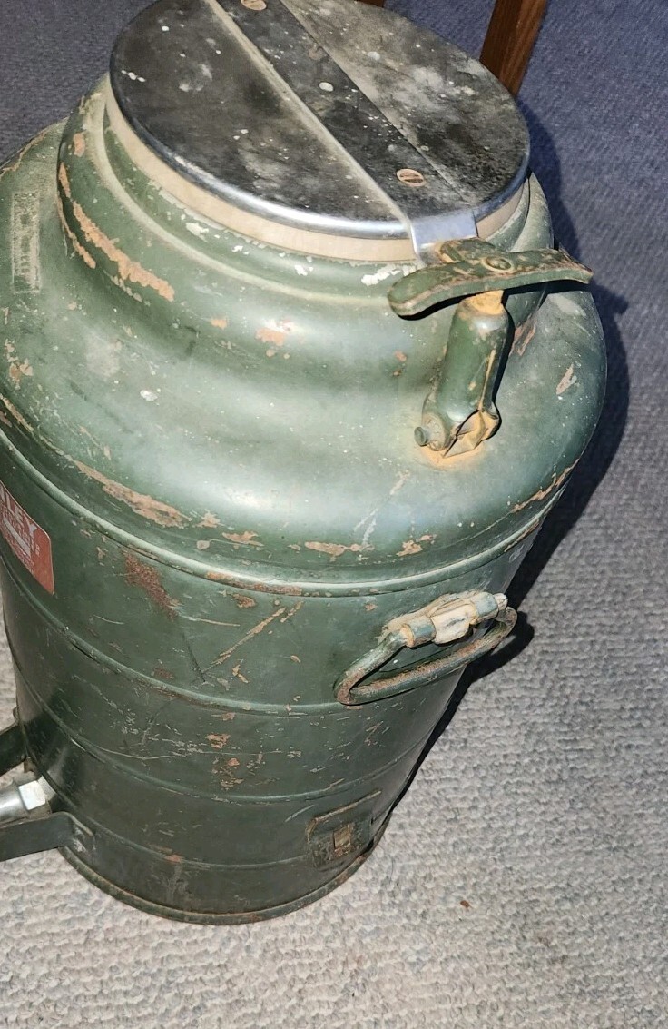 Here is a neat vintage Stanley 3323 jeep mount military style water cooler. Stainless steel liner. We have not tested putting liquid in it. Fresh find from an estate. Has some wear from age and use but overall decent condition for a field use item.