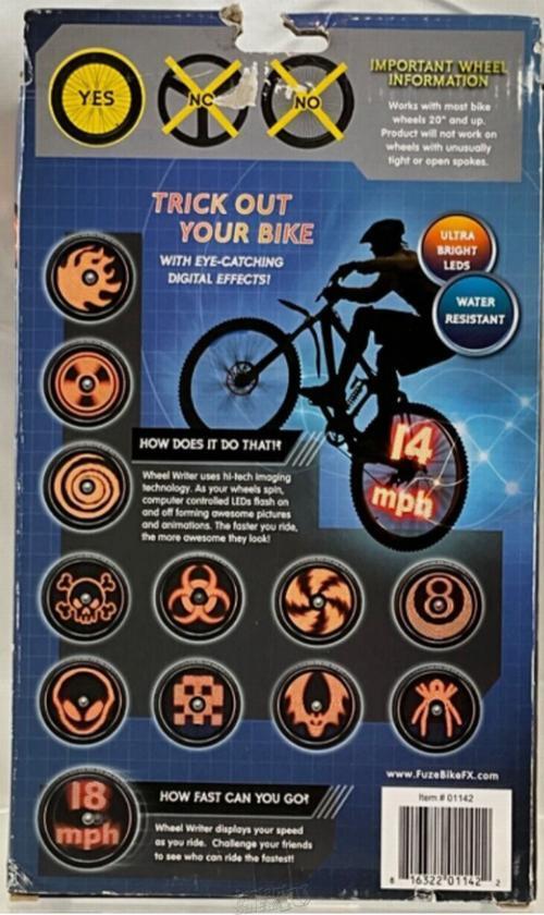 This high-quality wheel light is great for parents who value safety and visibility for their kiddos while cycling. The product features 12 images and animations, making it a fun and unique addition to your bike. Crafted by Skyrocket, LLC. Get your hands on the Fuze Wheel Writer today and elevate your cycling experience!