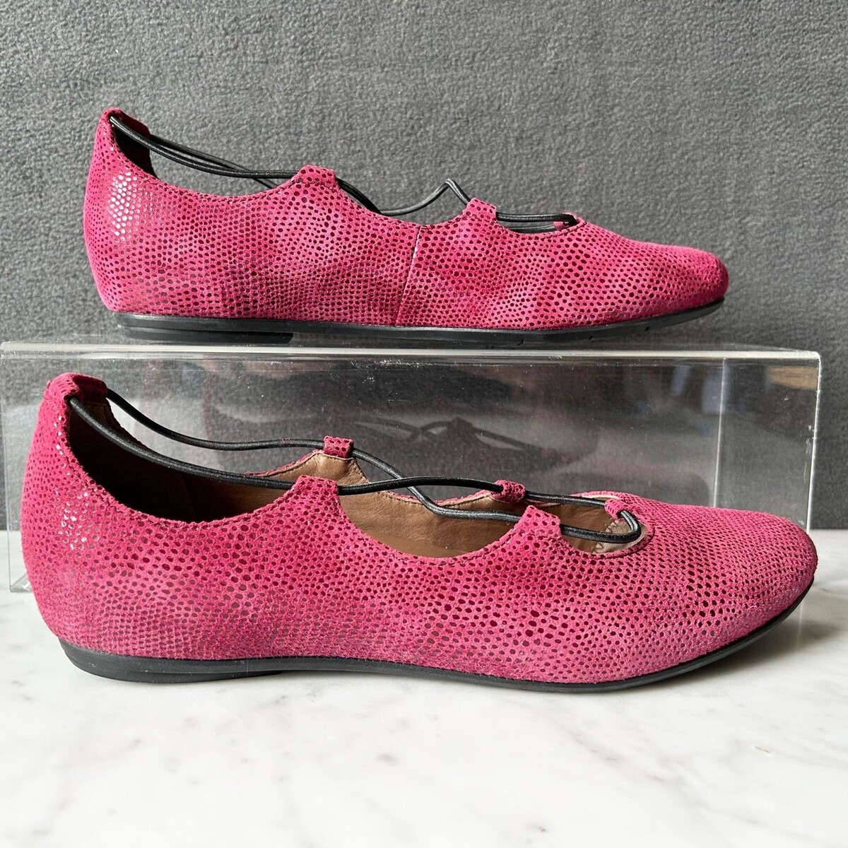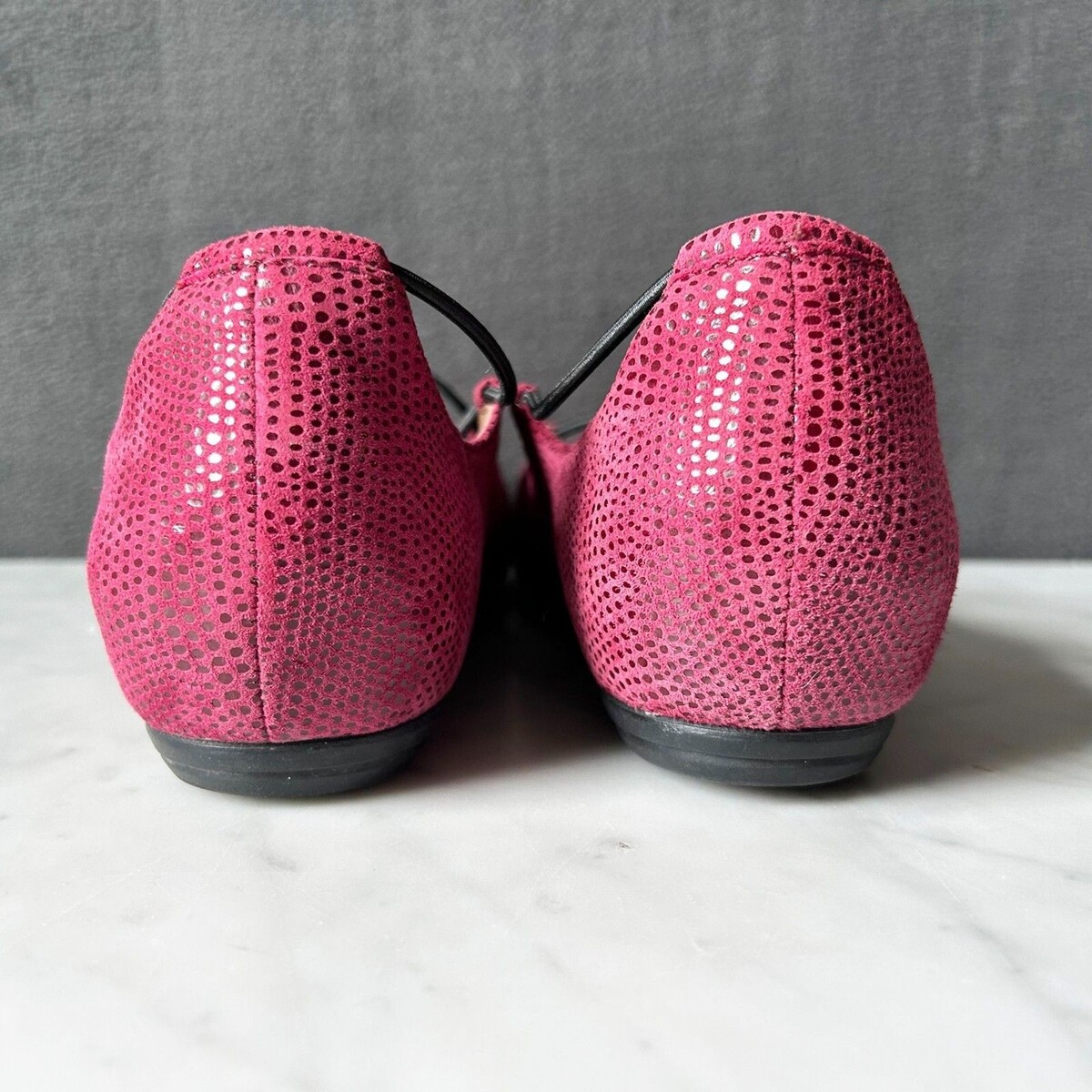 Earthies Essen by Earth women's size 9B ballet flats. Burgundy suede leather reptile print upper with black elastic strap. Rubber sole. Excellent condition.