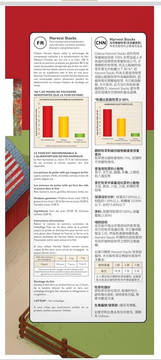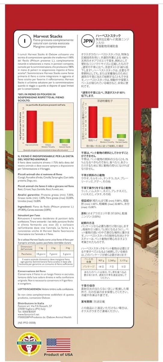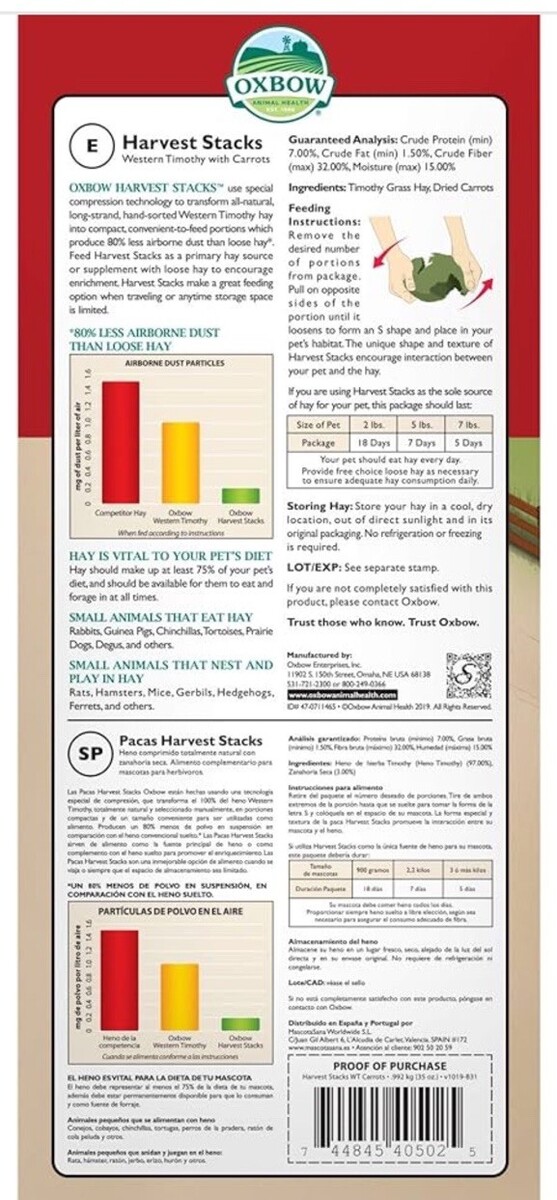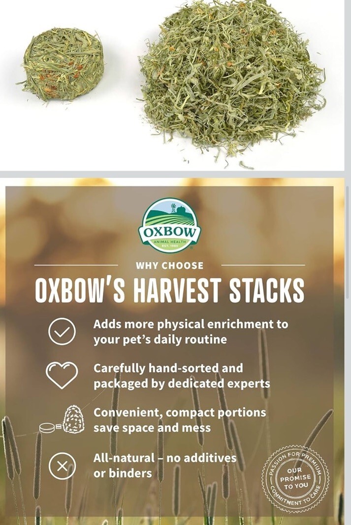 The Animal Health Harvest Hay Stacks by Oxbow are a nutritious and delicious treat for small animals like rabbits and guinea pigs. These hay stacks are made with Western Timothy Hay and Carrots, providing essential fiber and vitamins for a healthy diet. The package dimensions are 11.57x4.8x4.65 inches, and each stack weighs 2.54 pounds, making it convenient for serving and storing. Give your furry friends a tasty and beneficial snack with these all-natural hay stacks.