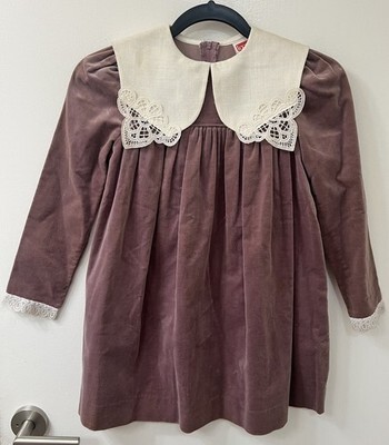The Vintage Love Brand Girls Long Sleeve Collared lace Dress in size 6X is a beautiful and classic piece for young girls. The soft mauve lilac color adds a touch of sweetness, while the long sleeves and collared neckline provide a sophisticated look. This dress is perfect for special occasions or everyday wear. The intricate lace detailing adds a vintage flair to the overall design, making it a timeless and stylish choice for any little girl's wardrobe. There is some staining on the collar+on the front of dress and a tiny hole from tag on the center of upper part of the front of dress as shown in photos. Please let me know if you have any questions!