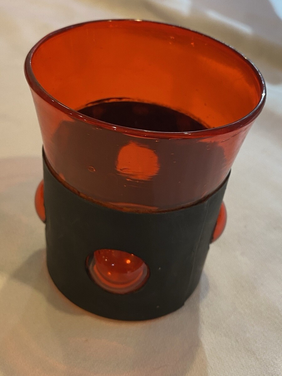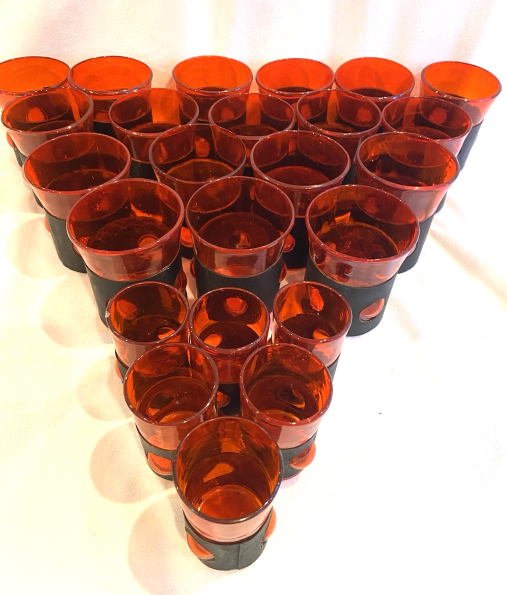 Vintage RARE 17 Red Whiskey Blown Bubble Glasses w/ Black /6 Shot Glasses